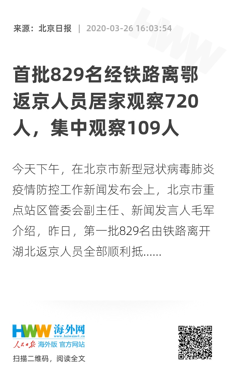 今天下午,在北京市新型冠状病毒肺炎疫情防控工作新闻发布会上,北京市重点站区管委会副主任、新闻发言人毛军介绍,昨日,第一批829名由铁路离开湖北返京人员全部顺利抵京(其中居家观察720人,集中观察109人)。