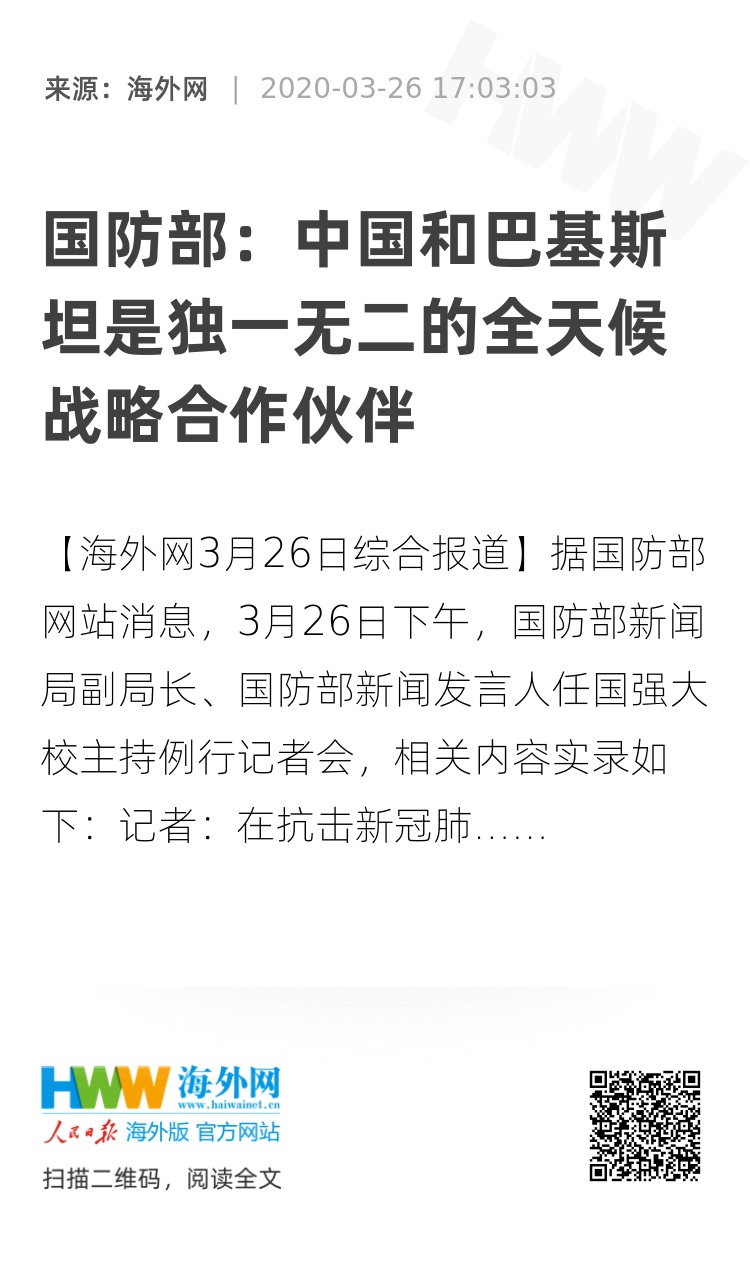 记者:在抗击新冠肺炎疫情的关键阶段,请问中国和巴基斯坦两军如何开展疫情合作?中方如何看待当前两军关系?