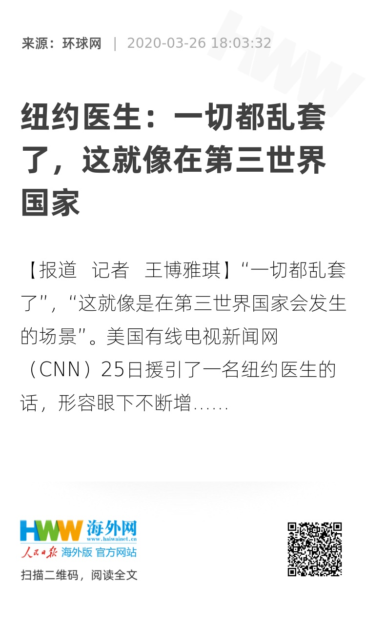 【环球网报道 记者 王博雅琪】“一切都乱套了”,“这就像是在第三世界国家会发生的场景”。美国有线电视新闻网(CNN)25日援引了一名纽约医生的话,形容眼下不断增加的新冠肺炎患者已开始让美国的医院不堪重负。