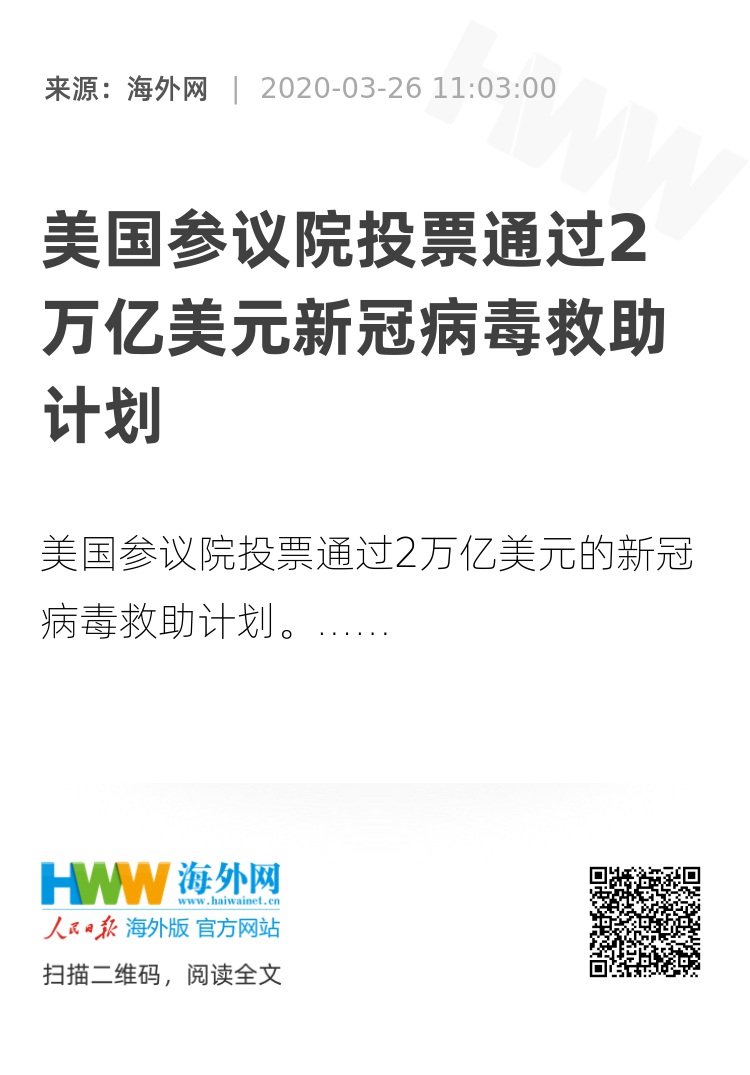 【海外网3月26日|战疫全时区】 据俄罗斯卫星社报道,当地时间25日,美国参议院投票通过2万亿美元的新冠病毒救助计划。