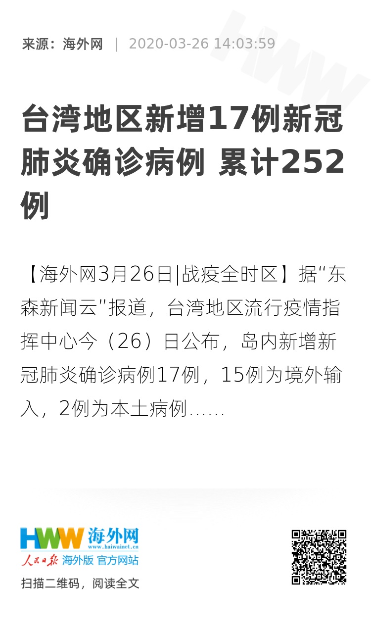 【海外网3月26日|战疫全时区】据“东森新闻云”报道,台湾地区流行疫情指挥中心今(26)日公布,岛内新增新冠肺炎确诊病例17例,15例为境外输入,2例为本土病例,目前台湾地区累计252例。