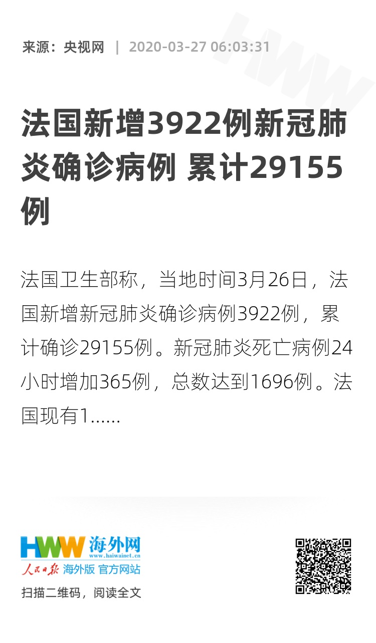 法国卫生部称,当地时间3月26日,法国新增新冠肺炎确诊病例3922例,累计确诊29155例。新冠肺炎死亡病例24小时增加365例,总数达到1696例。法国现有13904例确诊病例在住院治疗,其中3375人接受重症监护,3375人中58%的患者年龄在60岁到80岁之间。目前法国已经有4948人治愈。(总台记者 江华)