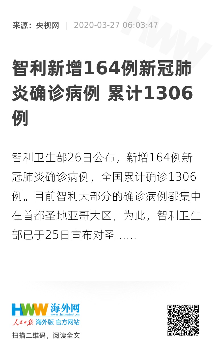 31752652,.智利新增164例新冠肺炎确诊病例 累计1306例,.2020-03-27 06:39:47,.204442,.张婧妍