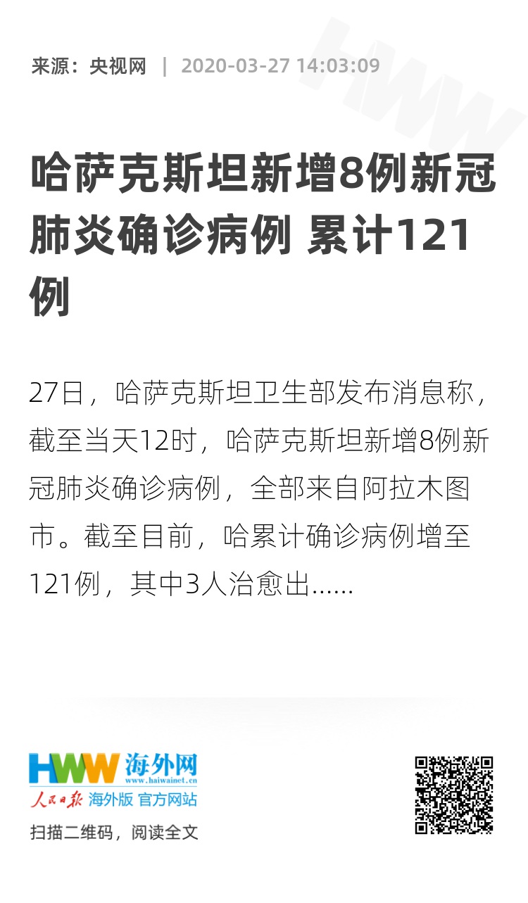31753164,.哈萨克斯坦新增8例新冠肺炎确诊病例 累计121例,.2020-03-27 14:13:09,.204442,.张婧妍