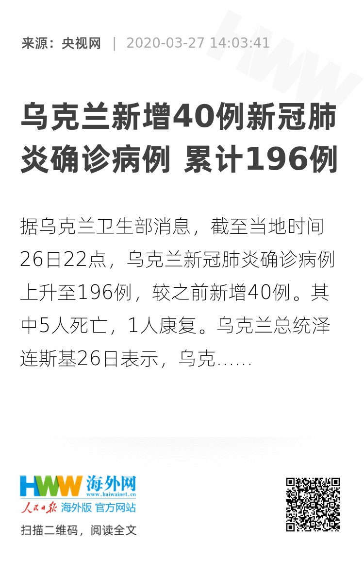 据乌克兰卫生部消息,截至当地时间26日22点,乌克兰新冠肺炎确诊病例上升至196例,较之前新增40例。其中5人死亡,1人康复。乌克兰总统泽连斯基26日表示,乌克兰正抓紧从中国和韩国采购大量防疫物资,其中包括20万份检测试剂盒。泽连斯基同时宣布,乌克兰于27日关闭边境,未及时返回乌克兰的公民将由乌克兰驻外外交机构提供帮助。(总台记者 朱静)