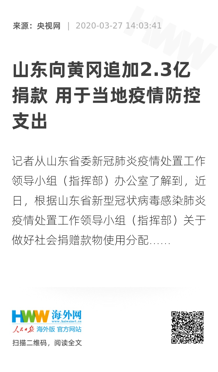记者从山东省委新冠肺炎疫情处置工作领导小组(指挥部)办公室了解到,近日,根据山东省新型冠状病毒感染肺炎疫情处置工作领导小组(指挥部)关于做好社会捐赠款物使用分配管理工作的通知》精神,经研究决定,从疫情防控募集资金汇集专户中拨付23165.87万元,用于湖北省黄冈市疫情防控关键医疗设备购置、重要医疗设施建设运维以及其他与疫情防控相关的支出,以上资金已经拨付到位。