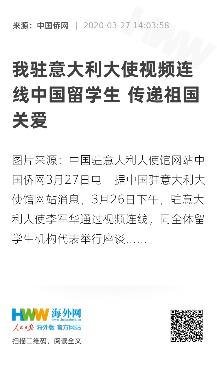 中国侨网3月27日电 据中国驻意大利大使馆网站消息,3月26日下午,驻意大利大使李军华通过视频连线,同全体留学生机构代表举行座谈会,60多位同学在线参加。