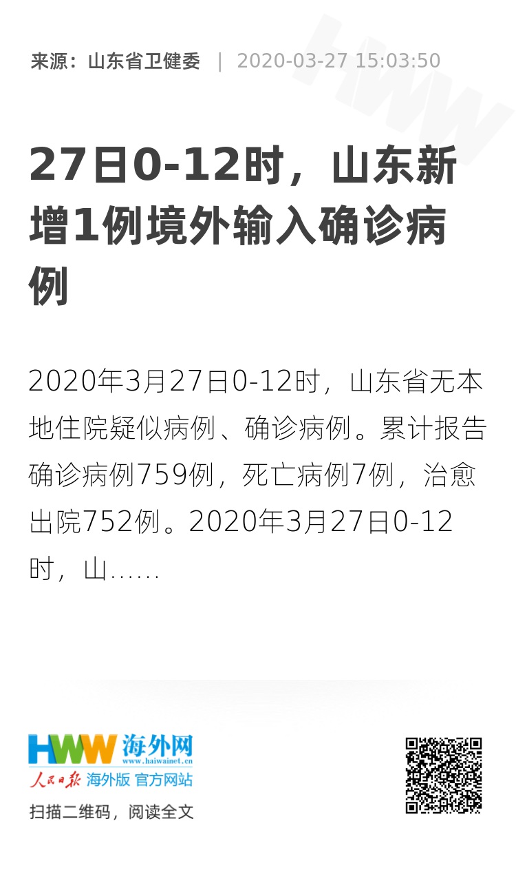 2020年3月27日0-12时,山东省无本地住院疑似病例、确诊病例。累计报告确诊病例759例,死亡病例7例,治愈出院752例。