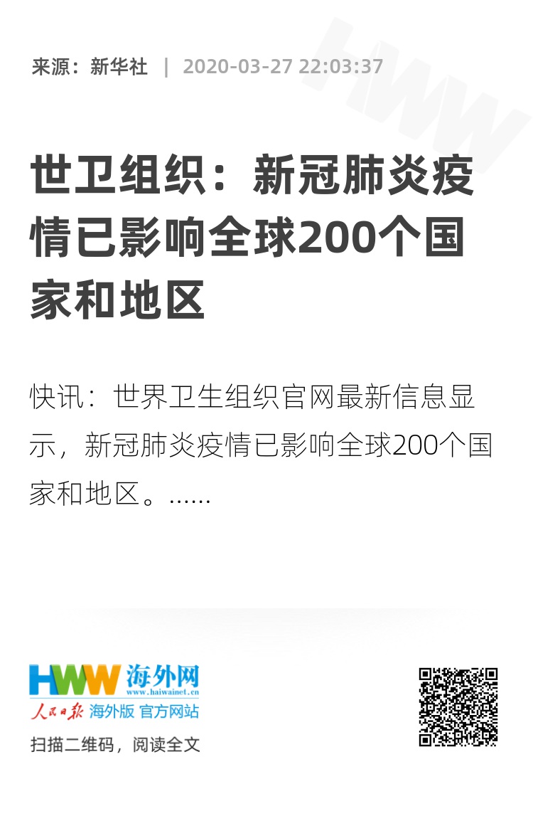 新华社快讯:世界卫生组织官网最新信息显示,新冠肺炎疫情已影响全球200个国家和地区。