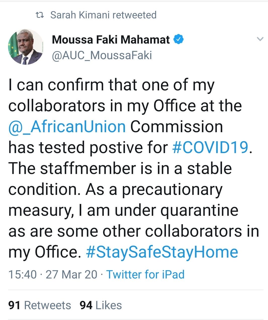 当地时间3月27日,非盟委员会主席法基在社交媒体上发布消息,称非盟总部主席办公室一位工作人员被确诊为新冠肺炎阳性,病情稳定。法基称,目前他与办公室的其他人员均已在家自我隔离。(总台记者 吴婷)