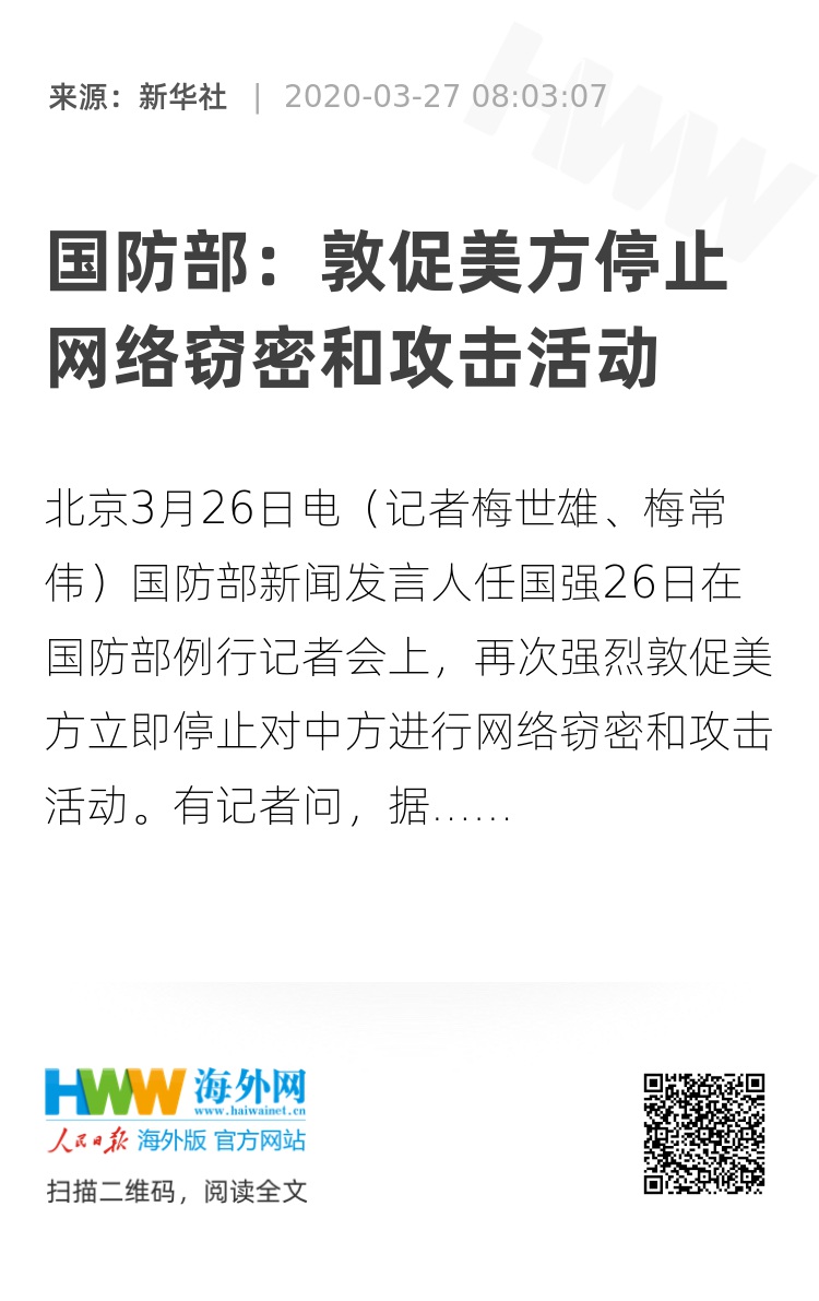 新华社北京3月26日电(记者梅世雄、梅常伟)国防部新闻发言人任国强26日在国防部例行记者会上,再次强烈敦促美方立即停止对中方进行网络窃密和攻击活动。