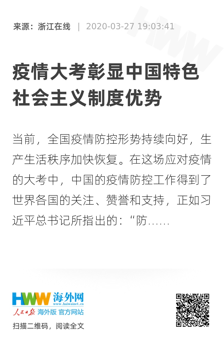当前,全国疫情防控形势持续向好,生产生活秩序加快恢复。在这场应对疫情的大考中,中国的疫情防控工作得到了世界各国的关注、赞誉和支持,正如习近平总书记所指出的:“防控工作取得的成效,再次彰显了中国共产党领导和中国特色社会主义制度的显著优势。”