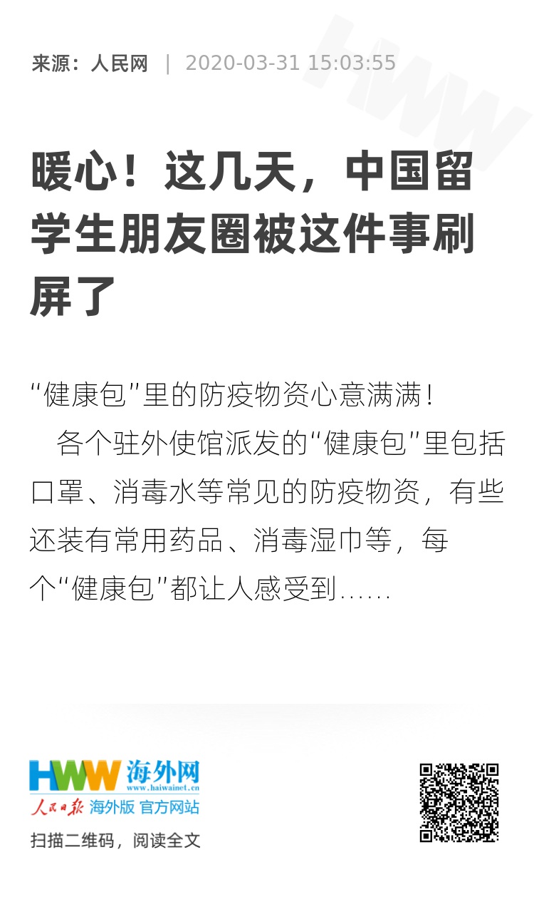 加拿大温哥华的留学生在朋友圈写道,“我可能永远都忘不了,学校里有来自世界各地的同学,到目前为止,我只看到中国在每个宿舍门口安排发放防疫物资。感谢祖国!”