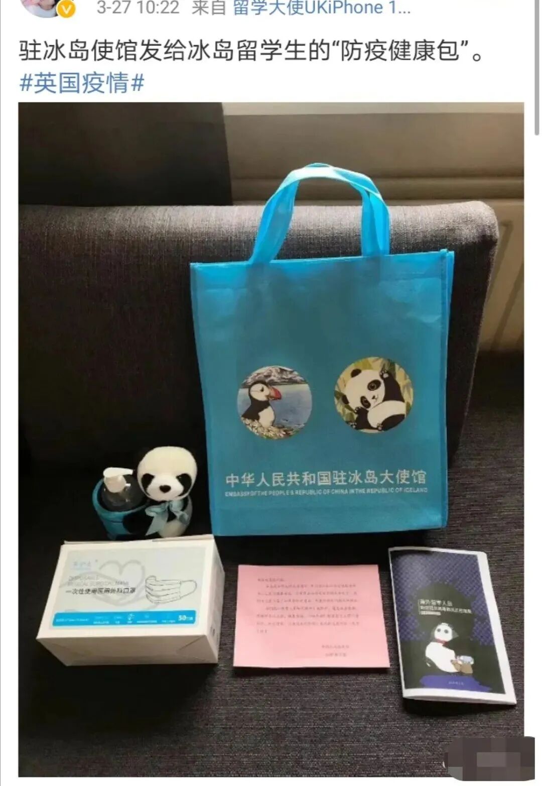 各个驻外使馆派发的“健康包”里包括口罩、消毒水等常见的防疫物资,有些还装有常用药品、消毒湿巾等,每个“健康包”都让人感受到心意满满!