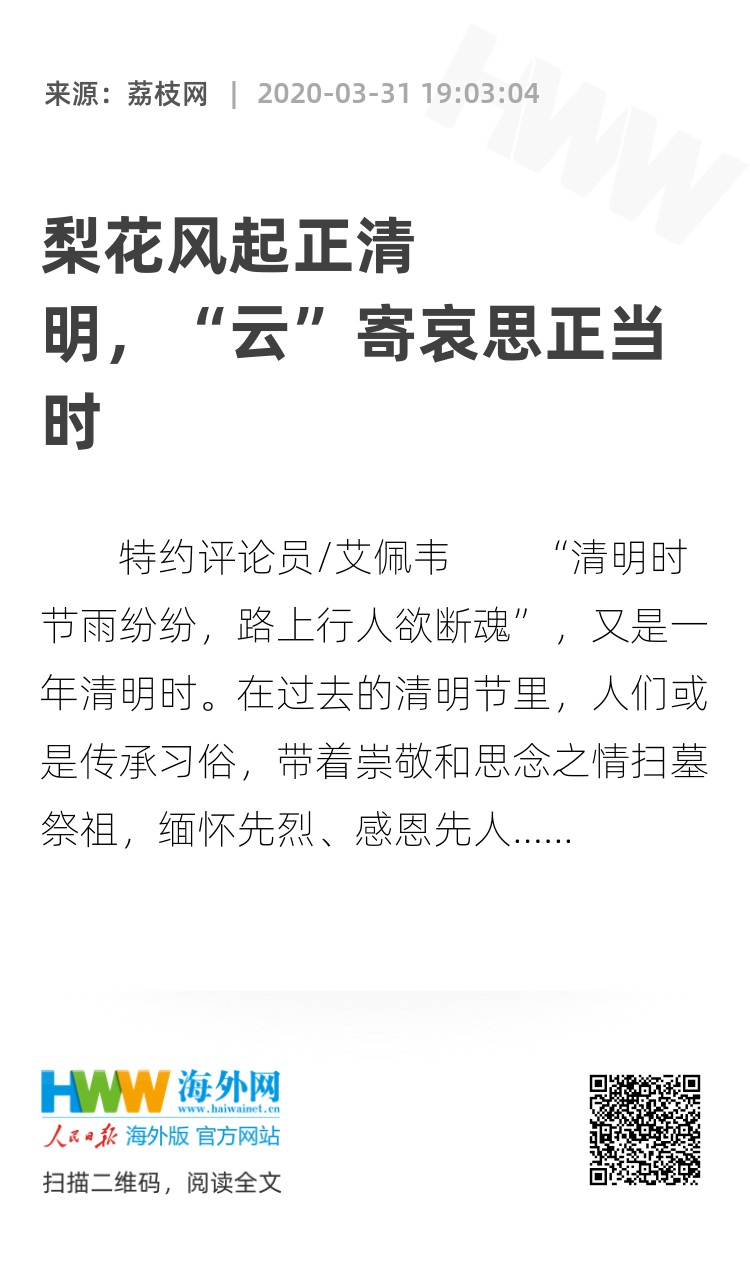 梨花风起正清明,“云”寄哀思正当时。自觉摒弃陋习,采用“云”寄哀思的文明祭祀方式,这个清明定会更加“清明”,这场战“疫”必将取得最后胜利,这份爱国情怀也必能凝聚起逐梦圆梦的更强合力。(艾佩韦)