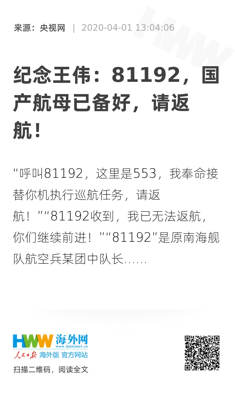 “呼叫81192,这里是553,我奉命接替你机执行巡航任务,请返航!”“81192收到,我已无法返航,你们继续前进!”“81192”是原南海舰队航空兵某团中队长王伟生前所驾驶的歼-8Ⅱ战机编号