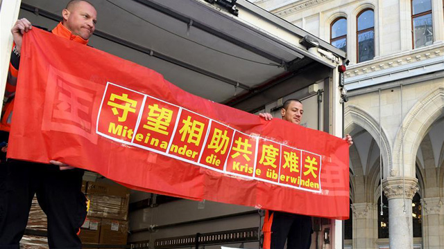3月31日,在奥地利维也纳,奥地利工作人员接收来自奥地利华侨华人捐助的防护口罩。 当日,奥地利华侨华人组织将购买的一批防护口罩捐助给奥地利维也纳市政府,随后这些口罩将由维也纳市政府统一发放给维也纳新冠肺炎疫情防控一线的医护人员。 新华社发 (周修怡 摄)