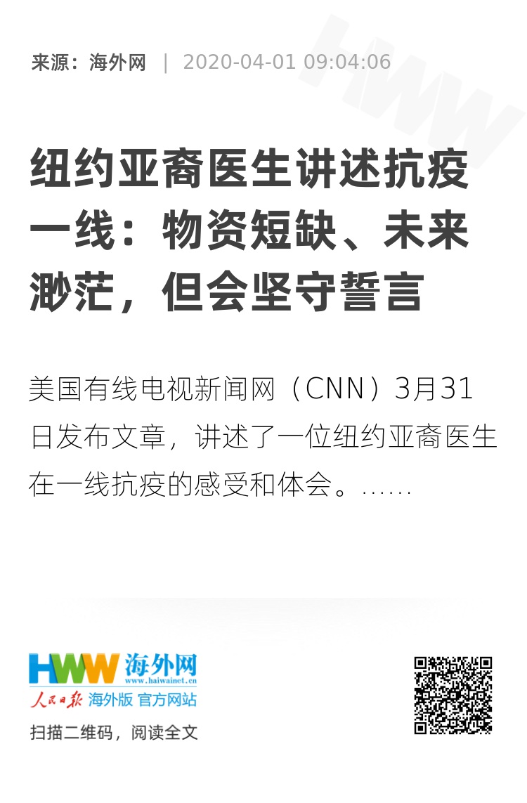 【海外网4月1日|战疫全时区】自新冠肺炎疫情在美国蔓延以来,纽约州和纽约市就一直是抗疫的第一线。当地时间3月31日,美国有线电视新闻网(CNN)刊登题为《纽约急诊医生细述抗疫一线物资短缺》的文章,从一位亚裔医务人员的视角关注了美国疫情“震中”的真实情况。