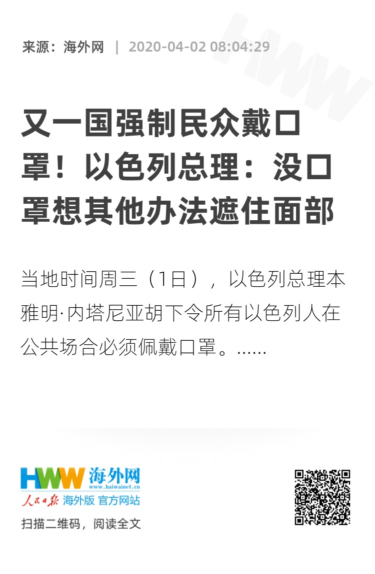 【海外网4月2日|战疫全时区】当地时间周三(1日),以色列总理本雅明·内塔尼亚胡下令所有以色列人在公共场合必须佩戴口罩,并称这是该国抗击新冠病毒蔓延所作努力的一部分。