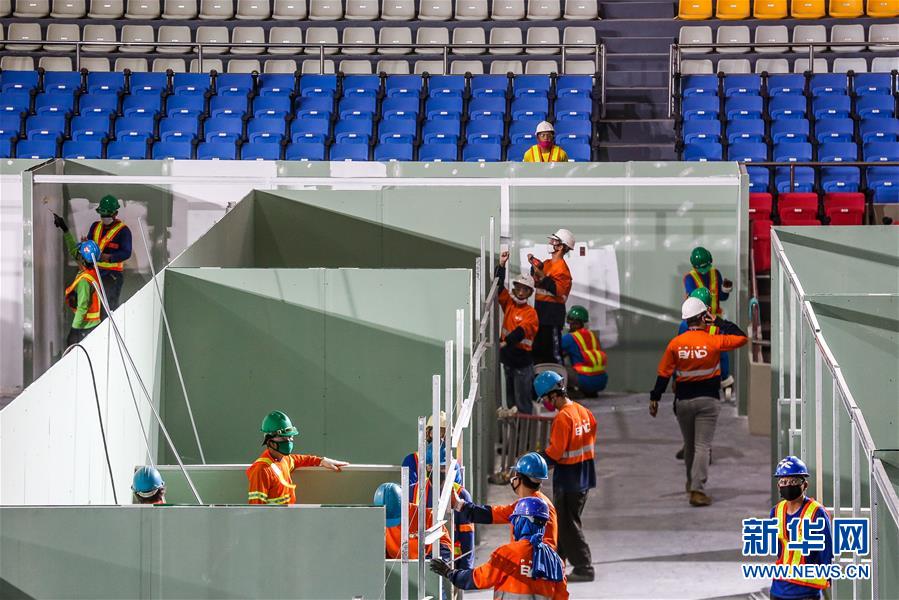 4月3日,在菲律宾首都马尼拉,工人在黎刹纪念体育馆内施工。 为了应对新冠肺炎疫情,菲律宾计划在4月12日前,将黎刹纪念体育馆等三个大型场馆改建为临时医疗场所,集中隔离收治。 新华社发(乌马利 摄)