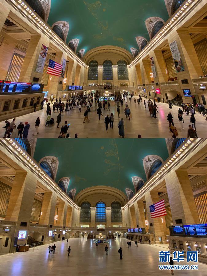 美国约翰斯·霍普金斯大学4月2日发布的最新统计数据显示,全球新冠肺炎确诊病例累计超过100万例。新冠疫情是21世纪全人类面临的一次最严峻挑战,为应对快速蔓延扩散的疫情,多国采取宵禁、封城等防控措施。 拼版照片显示:(上)2019年10月18日拍摄的美国纽约中央车站。新华社记者李木子摄。(下)2020年3月19日,美国纽约中央车站内旅客稀少。新华社发