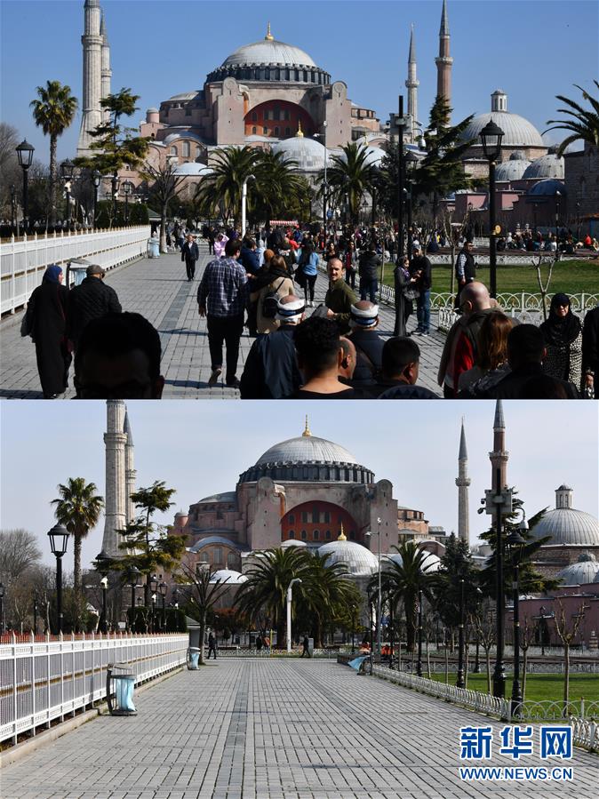 美国约翰斯·霍普金斯大学4月2日发布的最新统计数据显示,全球新冠肺炎确诊病例累计超过100万例。新冠疫情是21世纪全人类面临的一次最严峻挑战,为应对快速蔓延扩散的疫情,多国采取宵禁、封城等防控措施。 拼版照片显示:(上)2020年3月11日,游客走在土耳其伊斯坦布尔著名景点圣索菲亚大教堂外。(下)这是2020年3月30日在土耳其伊斯坦布尔拍摄的因疫情关闭后的圣索菲亚大教堂。 新华社记者 徐速绘 摄