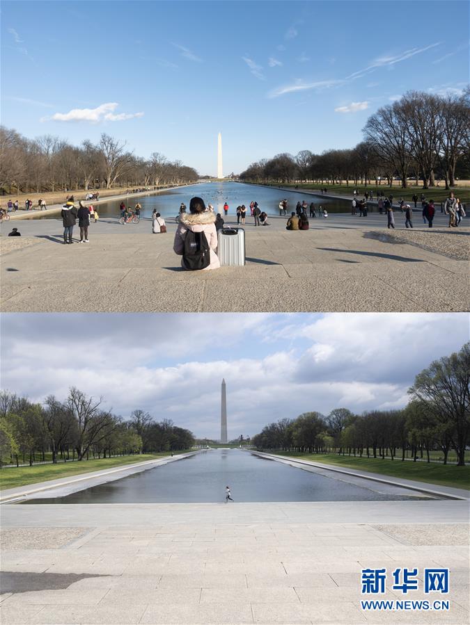 美国约翰斯·霍普金斯大学4月2日发布的最新统计数据显示,全球新冠肺炎确诊病例累计超过100万例。新冠疫情是21世纪全人类面临的一次最严峻挑战,为应对快速蔓延扩散的疫情,多国采取宵禁、封城等防控措施。 拼版照片显示:分别于2019年1月6日(上)和2020年4月1日(下)拍摄的美国首都华盛顿林肯纪念堂倒影池。 新华社记者 刘杰 摄