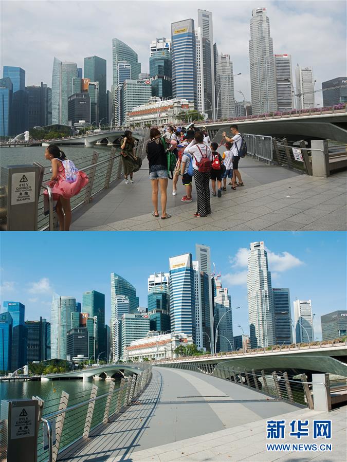 美国约翰斯·霍普金斯大学4月2日发布的最新统计数据显示,全球新冠肺炎确诊病例累计超过100万例。新冠疫情是21世纪全人类面临的一次最严峻挑战,为应对快速蔓延扩散的疫情,多国采取宵禁、封城等防控措施。 拼版照片显示:(上)2019年7月18日,游客在新加坡滨海湾金禧桥游览。(下)2020年4月2日,新加坡滨海湾金禧桥空无一人。 新华社发 (邓智炜摄)