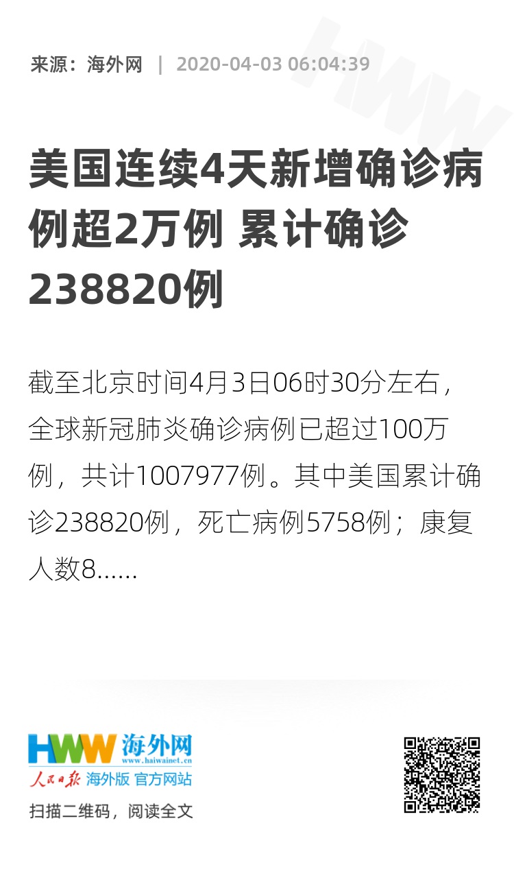 【海外网4月3日|战疫全时区】据美国约翰斯·霍普金斯大学发布的实时统计数据显示,截至北京时间4月3日06时30分左右,全球新冠肺炎确诊病例已超过100万例,共计1007977例。其中美国累计确诊238820例,确诊病例依然全球居首;死亡病例5758例;康复人数8889人。与前一天6时30分数据相比,美国新增确诊病例25448例,连续第4天新增确诊数超2万;死亡病例新增1001例。