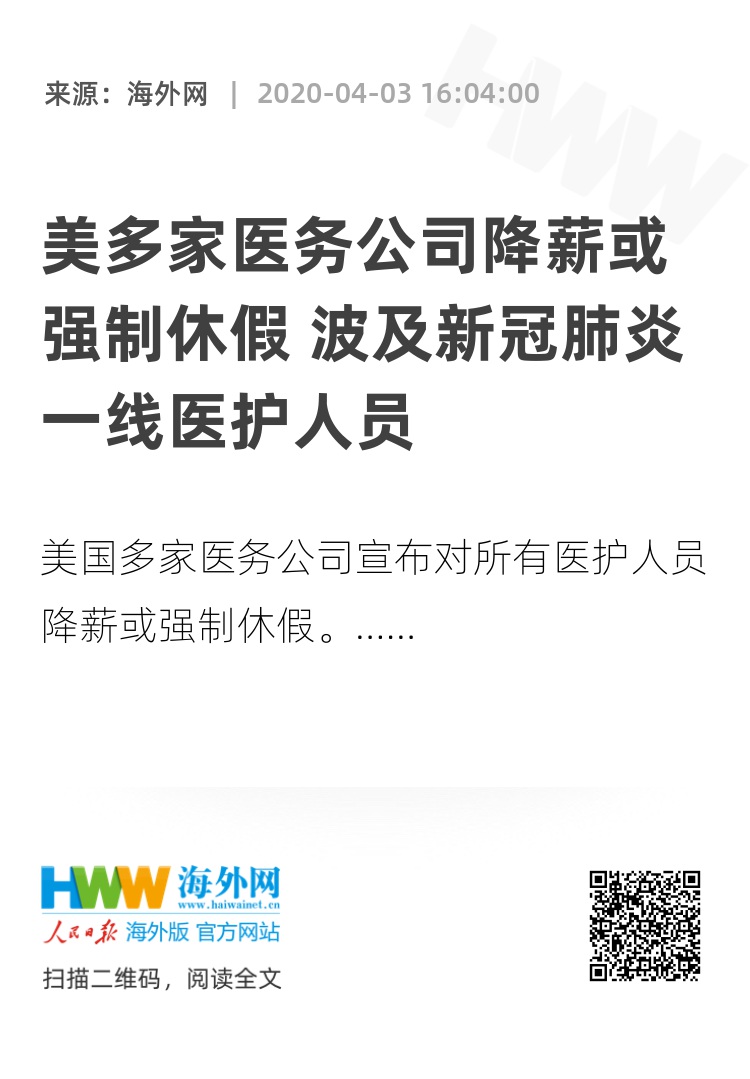 【海外网4月3日|战疫全时区】美国多家医务公司宣布将对所有医护人员采取降薪政策,波及工作在新冠肺炎一线的医护人员,并要求其他非一线员工休长假。