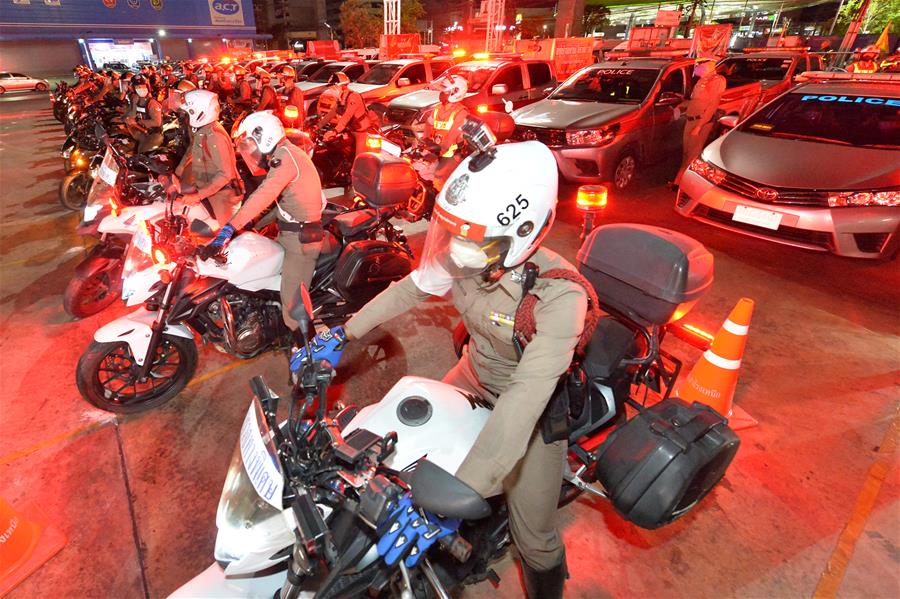 4月3日,泰国曼谷的警察集结准备执行宵禁任务。新华社发(拉亨 摄)