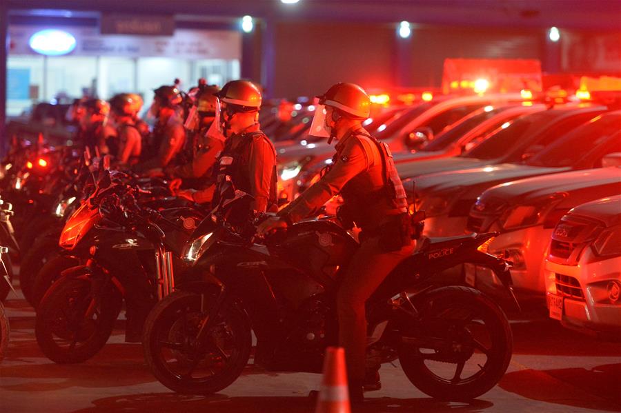 4月3日,泰国曼谷的警察集结准备执行宵禁任务。 新华社发(拉亨 摄)