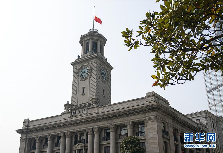 4月4日,武汉江汉关大楼下半旗志哀。 当日,武汉市举行哀悼活动,表达对抗击新冠肺炎疫情斗争牺牲烈士和逝世同胞的深切哀悼。 新华社记者 熊琦 摄