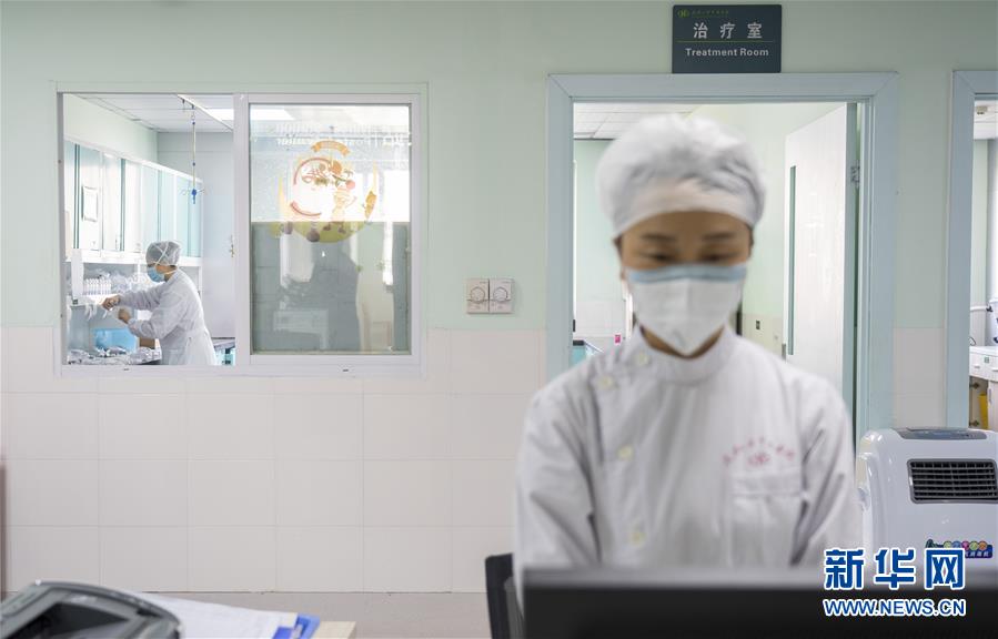 4月4日,在武汉大学中南医院住院部,一名医护人员在默哀,另一名医护人员在紧急为病人配药。 当日,武汉市举行哀悼活动,表达对抗击新冠肺炎疫情斗争牺牲烈士和逝世同胞的深切哀悼。 新华社记者 才扬 摄