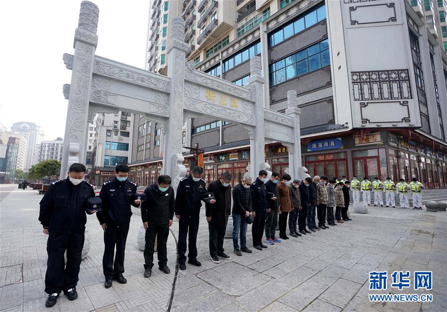 4月4日,武汉汉正街工委干部职工及派出所民警在汉正街步行街默哀。 当日,武汉市举行哀悼活动,表达对抗击新冠肺炎疫情斗争牺牲烈士和逝世同胞的深切哀悼。 新华社记者 王毓国 摄