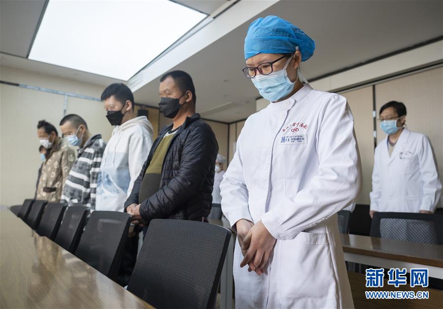 4月4日,在武汉大学中南医院住院部,医护人员与住院患者一同默哀。 当日,武汉市举行哀悼活动,表达对抗击新冠肺炎疫情斗争牺牲烈士和逝世同胞的深切哀悼。 新华社记者 才扬 摄
