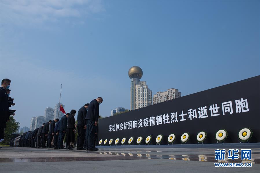 4月4日,在武汉汉口江滩一元广场,人们在哀悼活动中默哀。 当日,武汉市举行哀悼活动,表达对抗击新冠肺炎疫情斗争牺牲烈士和逝世同胞的深切哀悼。 新华社记者 肖艺九 摄