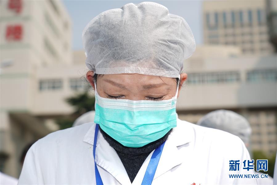 4月4日,在武汉市中南医院,人们在哀悼活动中默哀。 当日,武汉市举行哀悼活动,表达对抗击新冠肺炎疫情斗争牺牲烈士和逝世同胞的深切哀悼。 新华社记者 才扬 摄