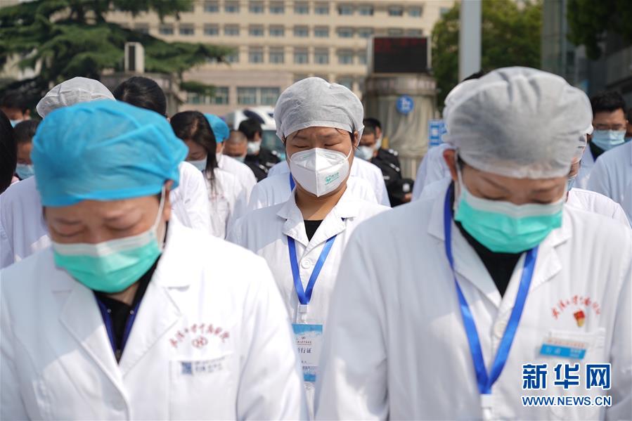 4月4日,在武汉市中南医院,人们在哀悼活动中默哀。 当日,武汉市举行哀悼活动,表达对抗击新冠肺炎疫情斗争牺牲烈士和逝世同胞的深切哀悼。 新华社记者 才扬 摄