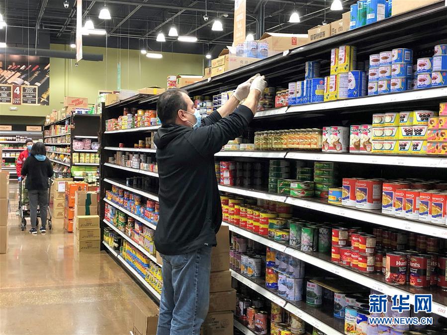 4月3日,工作人员在美国达拉斯北郊的一个超市内整理货架商品。 美国总统特朗普3日说,美国疾病控制和预防中心已建议民众用“布制面罩”对面部进行防护,以阻断新冠病毒的传播。 新华社发(田丹摄)