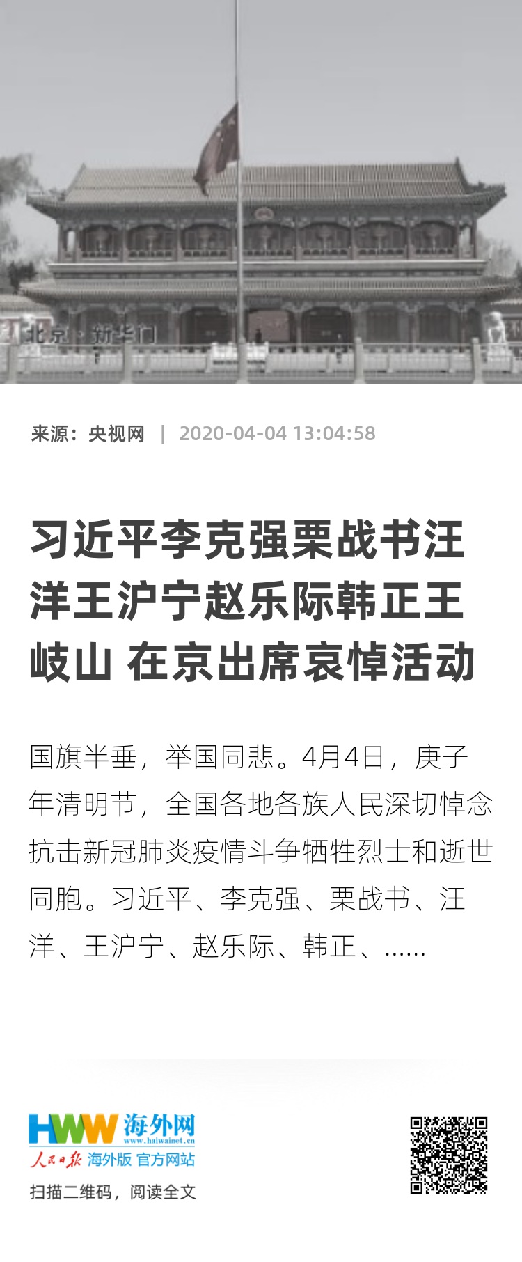 国旗半垂,举国同悲。4月4日,庚子年清明节,全国各地各族人民深切悼念抗击新冠肺炎疫情斗争牺牲烈士和逝世同胞。