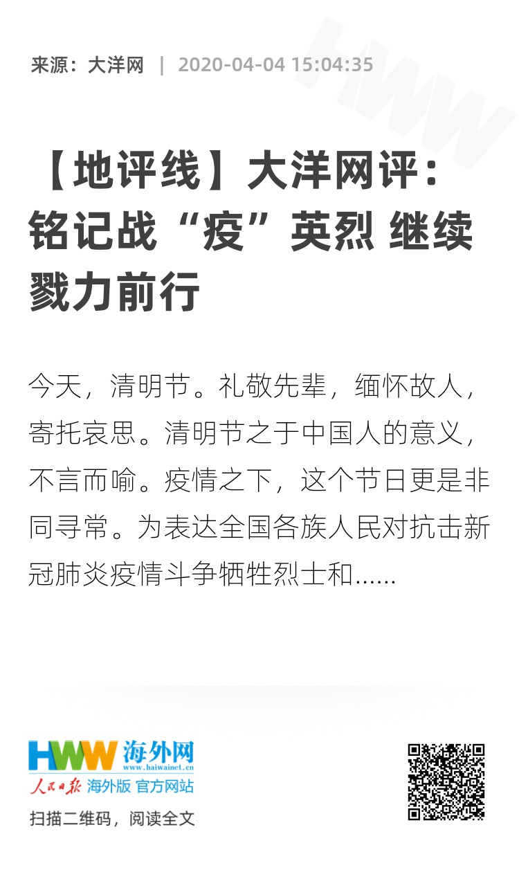 逝者已矣,生者如斯。当警报在城市与乡村的上空鸣响,记忆会翻滚、流淌,泪水或许会“洗刷”脸庞——逝者远行,活着的人还要继续战斗;往者不复,来者仍需去拼、去冲、去期待。别忘了,战“疫”方到半场,大考还在进行。尤其眼下,疫情防控与复工复产任务依然艰巨繁重,决不能掉以轻心、麻痹大意,务必把各项决策部署继续落实、落细。我们安好,这是对逝者最好的缅怀;拿下全胜,才能告慰英烈的牺牲。