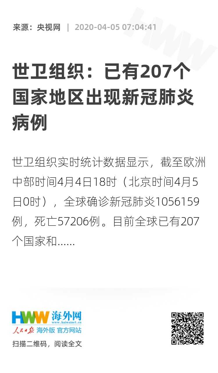 世卫组织实时统计数据显示,截至欧洲中部时间4月4日18时(北京时间4月5日0时),全球确诊新冠肺炎1056159例,死亡57206例。目前全球已有207个国家和地区出现新冠肺炎病例,中国以外超过97万例。(总台记者朱赫)