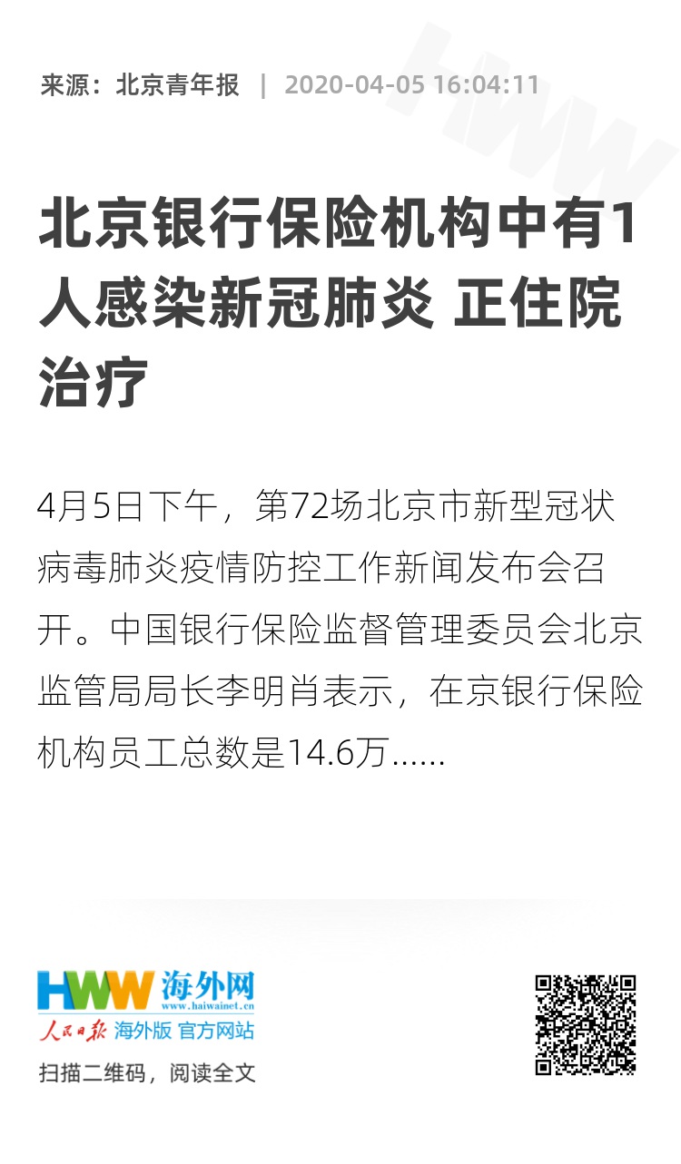 4月5日下午,第72场北京市新型冠状病毒肺炎疫情防控工作新闻发布会召开。中国银行保险监督管理委员会北京监管局局长李明肖表示,在京银行保险机构员工总数是14.6万人,累计报告1例员工感染新冠肺炎病例,目前正在住院治疗,还有一例密切接触者已经解除隔离。