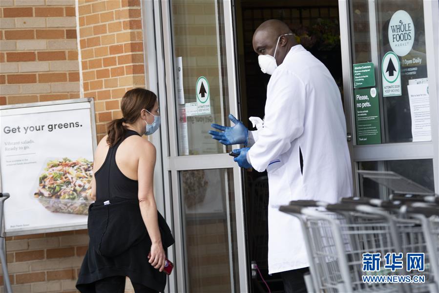 4月4日,在美国弗吉尼亚州阿灵顿,戴口罩的市民走进一家超市。新华社记者 刘杰 摄
