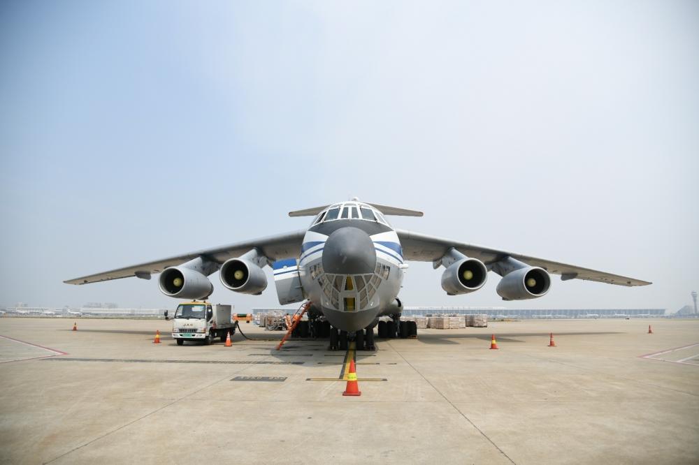 为保障这些包机快速运回防疫物资,浦东机场提前谋划,根据包机的类型和装载能力的大小,合理分配各种机位资源,为包机提供较为完备货运基础设施,实现快速装卸快速运输。图为俄罗斯空军伊尔76重型运输机。 (本文图片均为上海机场提供)