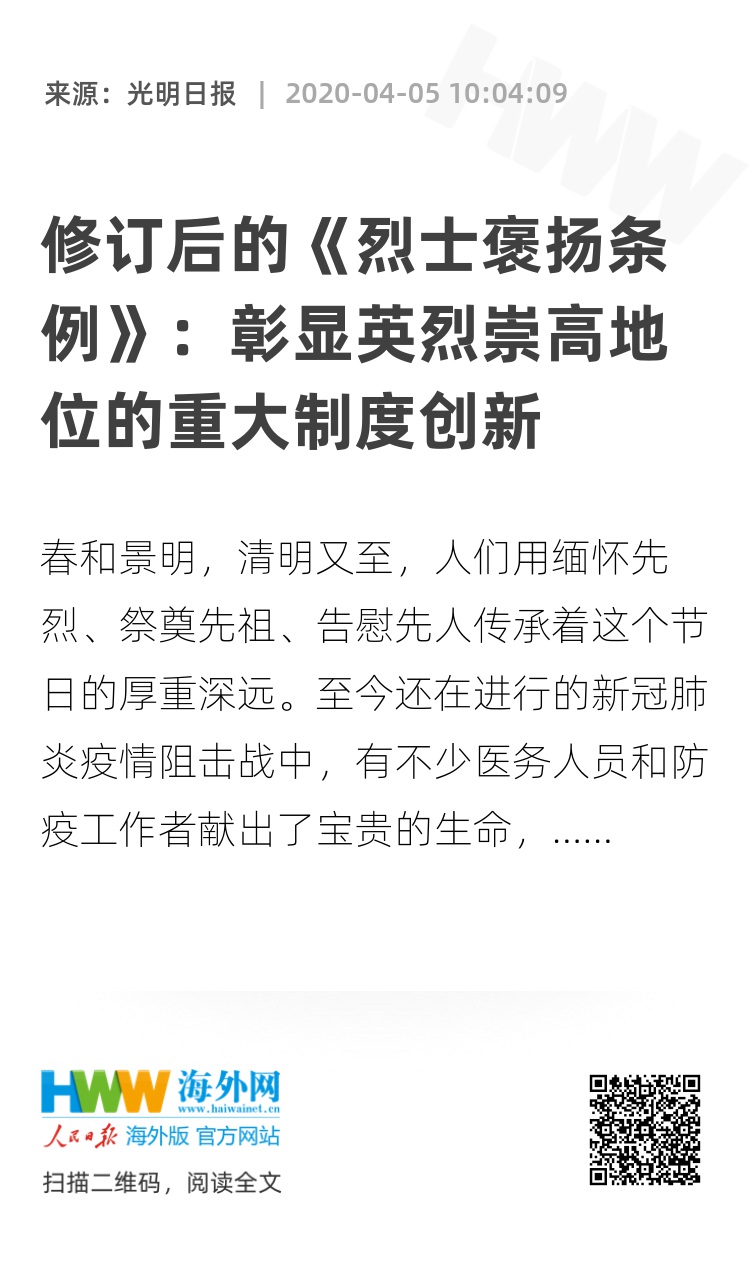 春和景明,清明又至,人们用缅怀先烈、祭奠先祖、告慰先人传承着这个节日的厚重深远。至今还在进行的新冠肺炎疫情阻击战中,有不少医务人员和防疫工作者献出了宝贵的生命,他们这种舍己救人的精神应予以大力褒扬,也应该在这样的节日里被大家铭记。