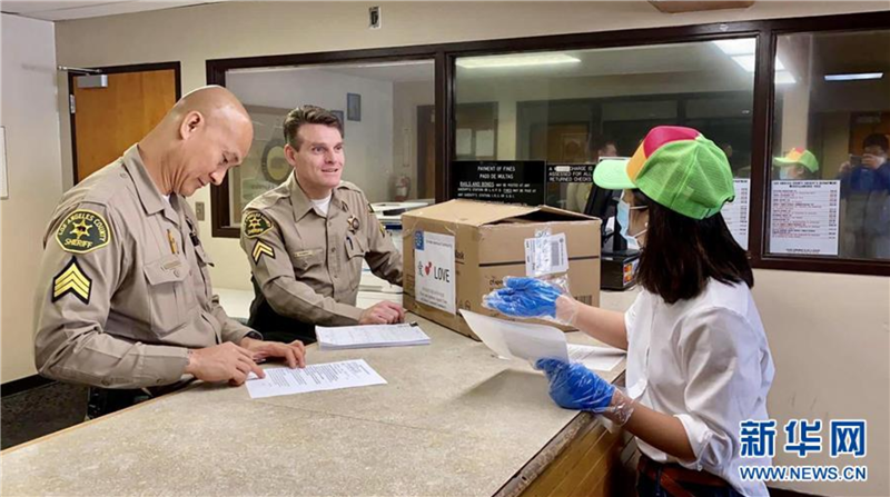 4月4日,在美国洛杉矶县,一名华人志愿者将捐赠的口罩送到当地警察局。 新华社发(杰夫·布朗摄)