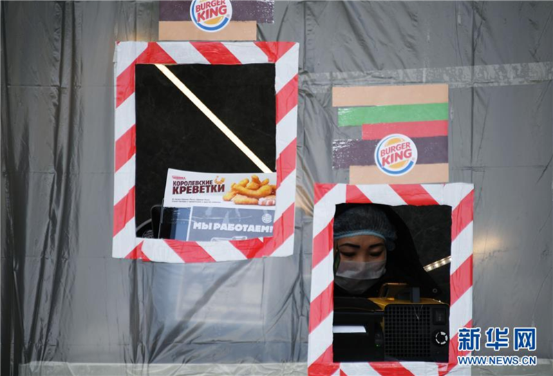 4月6日,在俄罗斯首都莫斯科,一名工作人员在快餐店工作。受疫情影响,快餐店停止堂食,仅提供外卖。 新华社/卫星社