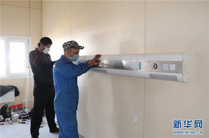 4月6日,在乌兹别克斯坦首都塔什干市郊,工人在方舱医院工地施工。 新华社发(扎法尔 摄)